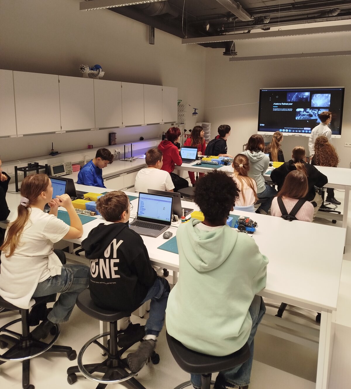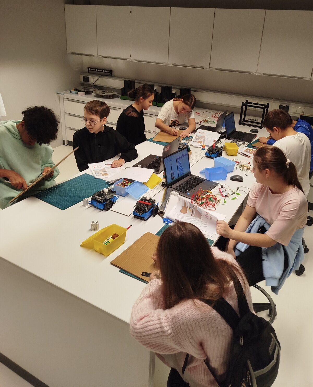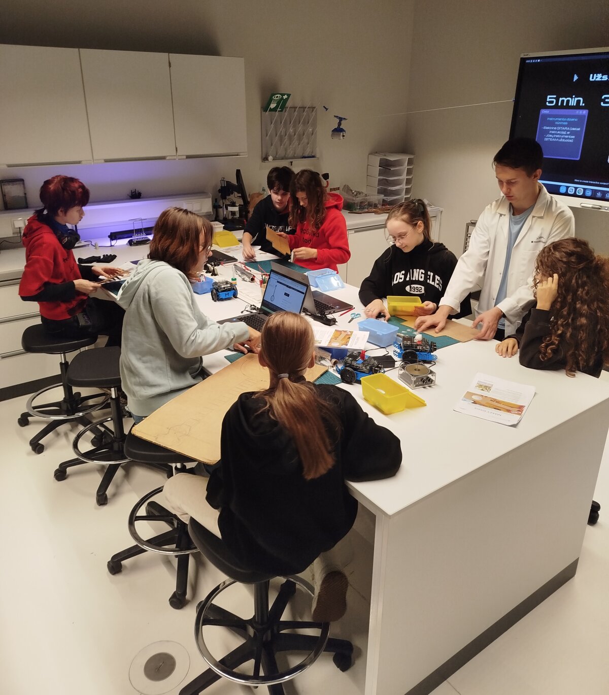 Fizikos laboratorijoje vyko kūrybiška ir įtraukianti veikla, kurioje mokiniai susipažino su fizikos dėsniais ir patys kūrė muzikos instrumentus. Užsiėmimo metu vaikai tyrinėjo, kaip keliauja elektra, kokio skonio ji yra ir kas jaučiama ją palietus. Jie nagrinėjo kaip sklinda garso bangos, bei praktiškai išbandė įvairias medžiagas ir technologijas. Mokiniai gamino paprastus, tačiau veikiančius instrumentus – nuo styginių ir pučiamųjų iki mušamųjų. Kiekvienas turėjo galimybę eksperimentuoti, konstruoti ir išbandyti savo sukurtą muzikinį instrumentą. Veikla ne tik lavino kūrybiškumą, bet ir padėjo suprasti mokslo bei meno dermę.